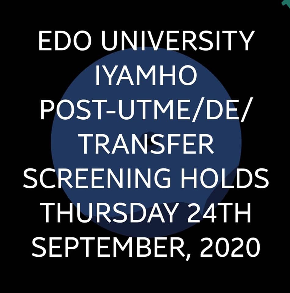 Currently, the 2020/2021 ACADEMIC SESSION FOR UNDERGRADUATE ADMISSION INTO EDO UNIVERSITY IYAMHO IS IN PROGRESS, WITH THE POST-UTME SCREENING DATE SLATED FOR 24TH SEPTEMBER 2020 AT 10AM