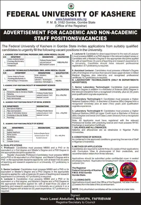Federal University of Kashere in Gombe State has announced a massive recruitment exercise for both academic and non-academic staff positions.