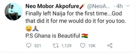 “Finally left Naija for the first time…God that did it for me would do it for you too. P.S Ghana is Beautiful.”