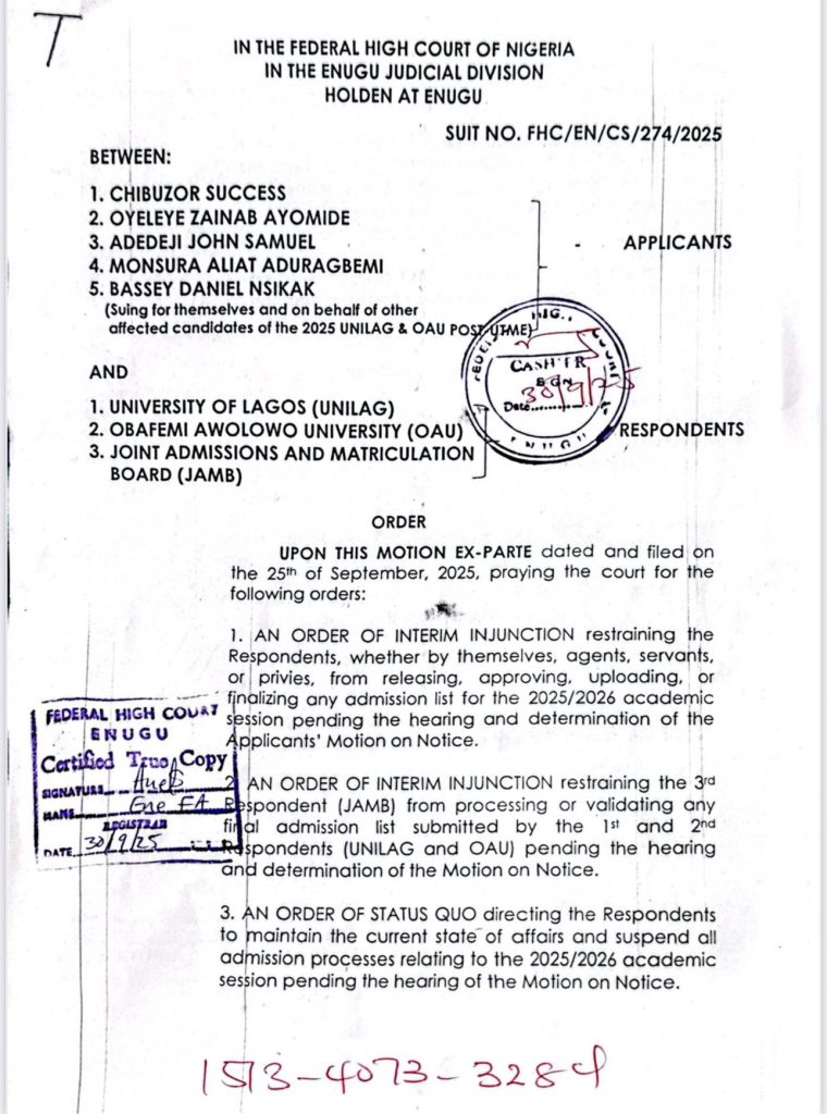 GoldenNewsNg reports that the Federal High Court sitting in Enugu has ordered the University of Lagos (UNILAG), Obafemi Awolowo University (OAU), and the Joint Admissions and Matriculation Board (JAMB) to suspend all admission processes for the 2025/2026 academic session.