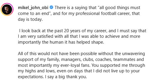John Obi Mikel who was Nigerian National team (Super Eagles) earlier today via his Instagram page has revealed his retirement from football after 20 years of successful matching records.