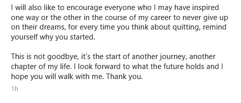 This is not goodbye, it’s the start of another journey, another chapter of my life. I look forward to what the future holds and I hope you will walk with me. Thank you.”