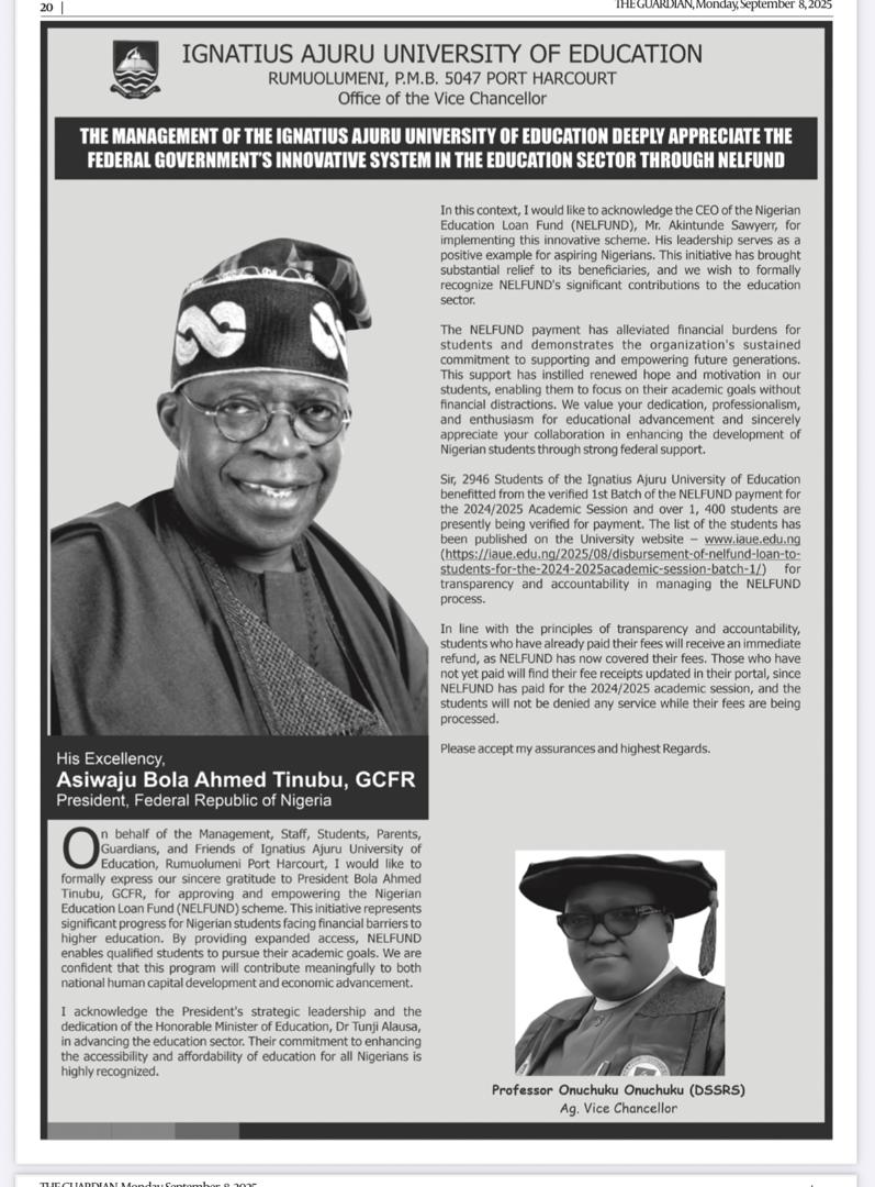 The management of Ignatius Ajuru University of Education (IAUE), Port Harcourt, has commended President Bola Ahmed Tinubu, GCFR, for the positive impact of the Nigerian Education Loan Fund (NELFUND) on the institution and its students.