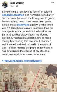 This had sparked comments online and some Nigerians were of the view that Reno did that because Jonathan raised him from grass to grace. Reacting to this, Reno has said that his loyalty isn’t for sale and he has never been on the grass.