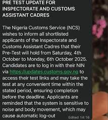 The Nigeria Customs Service (NCS) has officially announced the commencement of its Pre-Test for Inspectorate and Customs Assistant Cadre applicants.