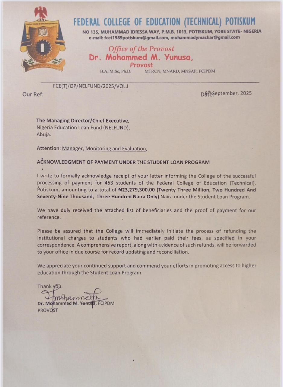 The Nigerian Education Loan Fund ( NELFUND ) has released a total of ₦23,279,300.00 to support students of the Federal College of Education (Technical), Potiskum.
