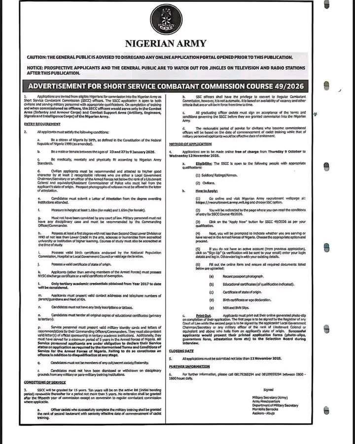 • Nigerian Army announces SSC Course 49/2026 recruitment.