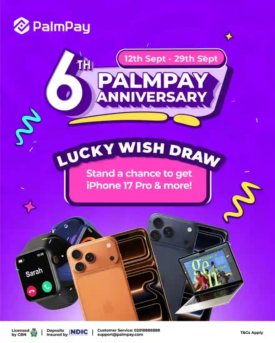 PalmPay has rolled out activities to mark its 6th anniversary with the launch of a special promotional campaign tagged the PalmPay Lucky Wish Challenge.