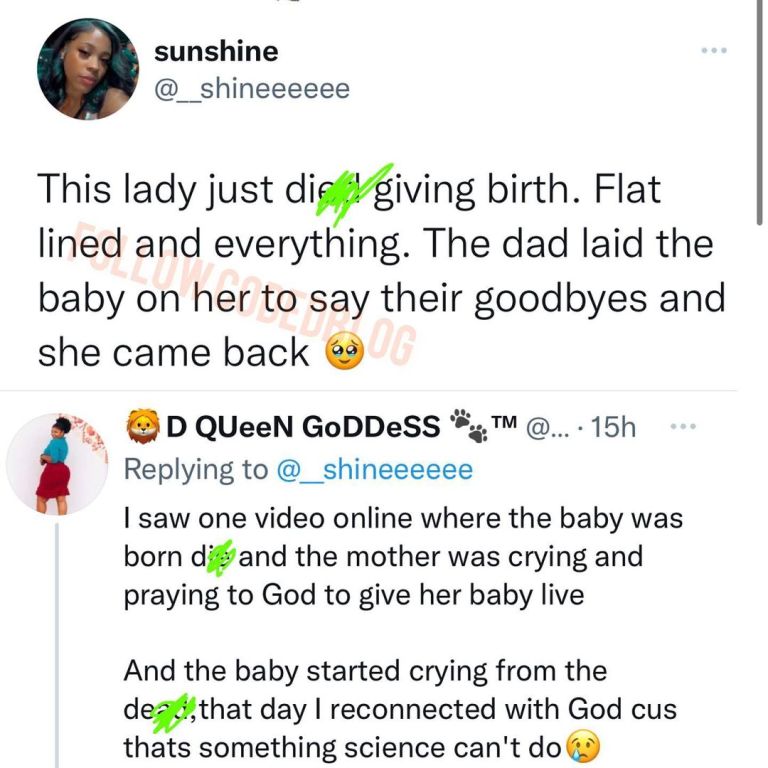 She tweeted; ”This lady just died giving birth. Flat lined and everything. The dad laid the baby on her to say their goodbyes and she came back”